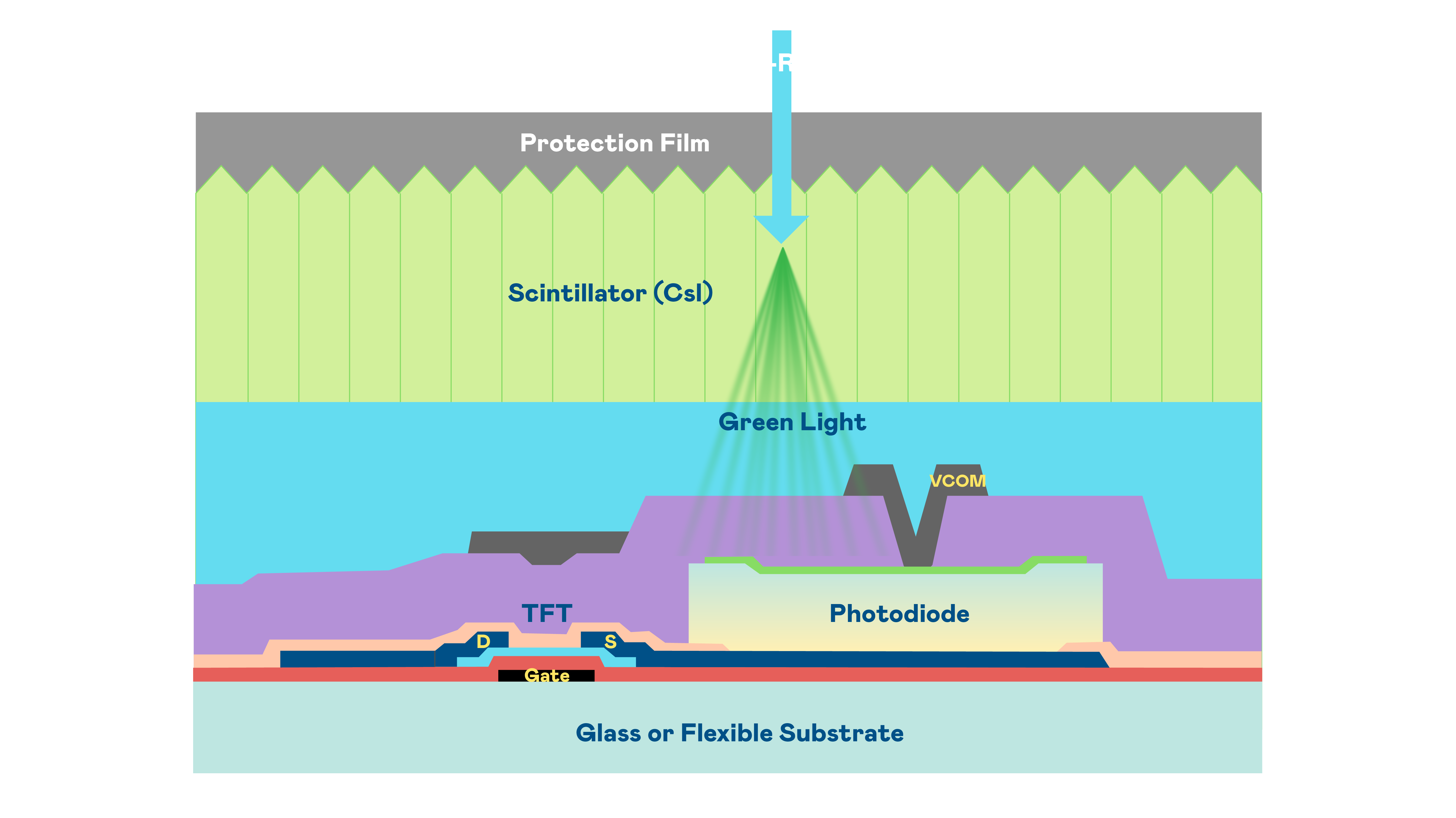 尊龙凯时的X光影像感测阵列使用薄膜电晶体 (TFT) 作为每个像素的读取开关,搭配光电二极体(Photodiode)的光电转换元件,用以感测X光影像讯号。